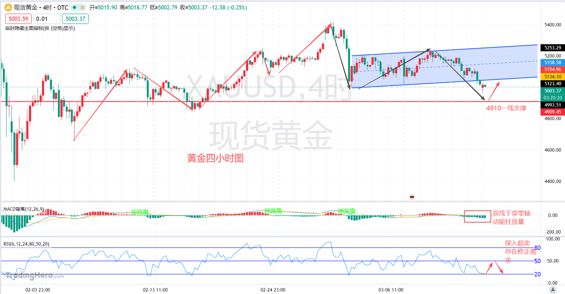 现在能够看到局势不仅没有按照川普的规划目标进行发展,反而有点控制不住的意思。在这样的局势下我们要思考的问题是,这个地缘的投机还能延续多久。核心矛盾就是美国为了维护中东军事霸权和能源定价权导致的,而现在这些目的都没有达到,按照川普这老头的性格,我看是不会那么善罢甘休,如果在中东这个地方没有占到便宜灰溜溜的跑了,全世界都能看到这老美就是个纸老虎,这样会加快全球去美元化进程。所以在我看来川普还是会在这个地方大动干戈,已经下水了就不怕把动静再闹的大一点,当矛盾不能解决的时候就把矛盾再一次的激化。现在技术面盘内下跌旗形初步成立了,下一个关口就是4800美元,这个位置跌破了就是多头大军摔杯为号,现在的行情就暂且先看看回调吧,不要硬抗,下跌很快,要问行情能够跌倒哪,我看4750-4800这个区间的支撑就是不错的上车机会。