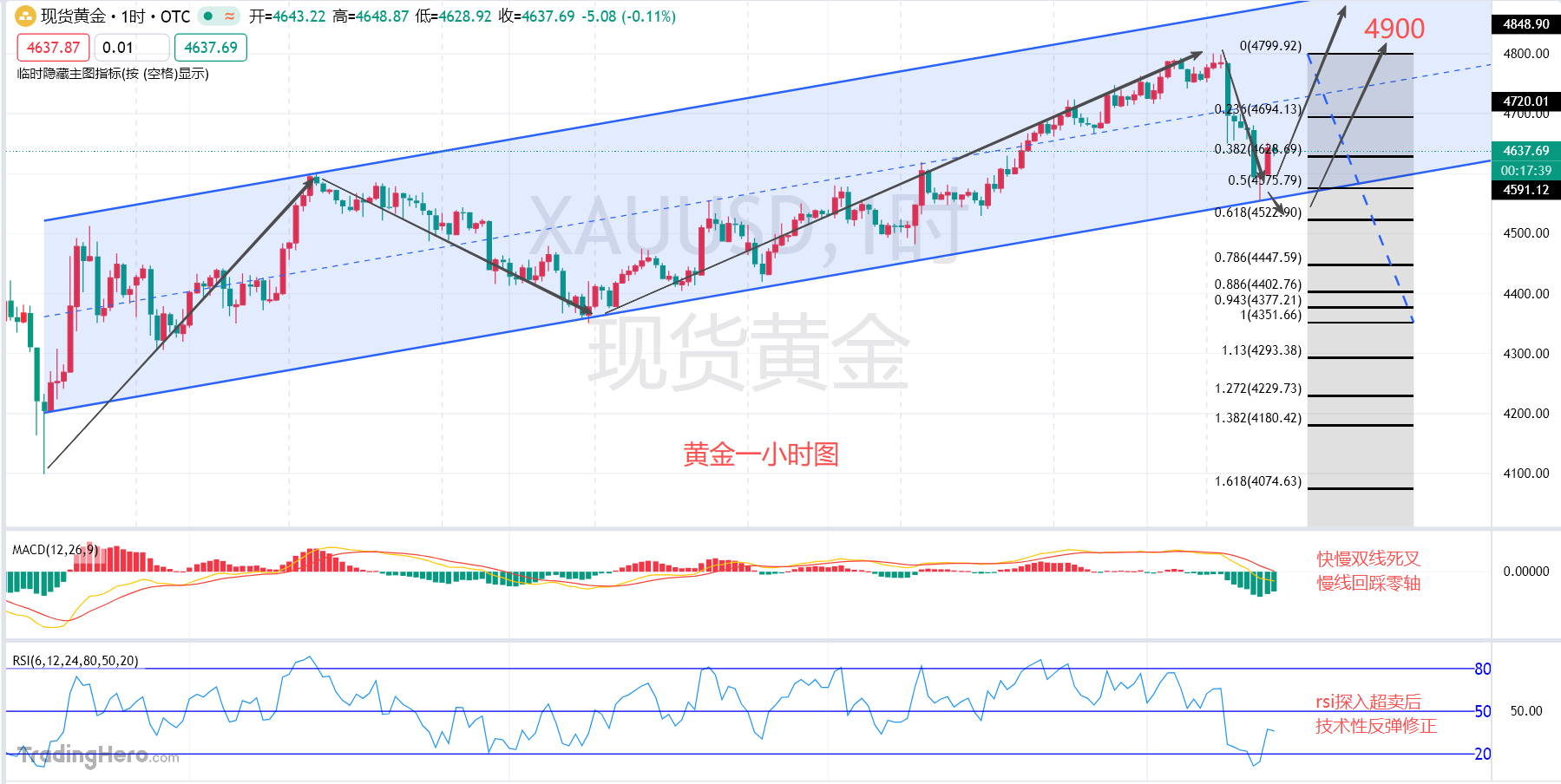 按照艾略特波浪理论来看行情,今天的抛售是处于上升五浪当中的四浪回踩,一小时级别实体收线于4595美元附近,刚好与一浪的高点收线重合,基本符合波浪理论五浪上涨,后市目标看向走出五浪测试上行通道的上轨压力4900美元附近。