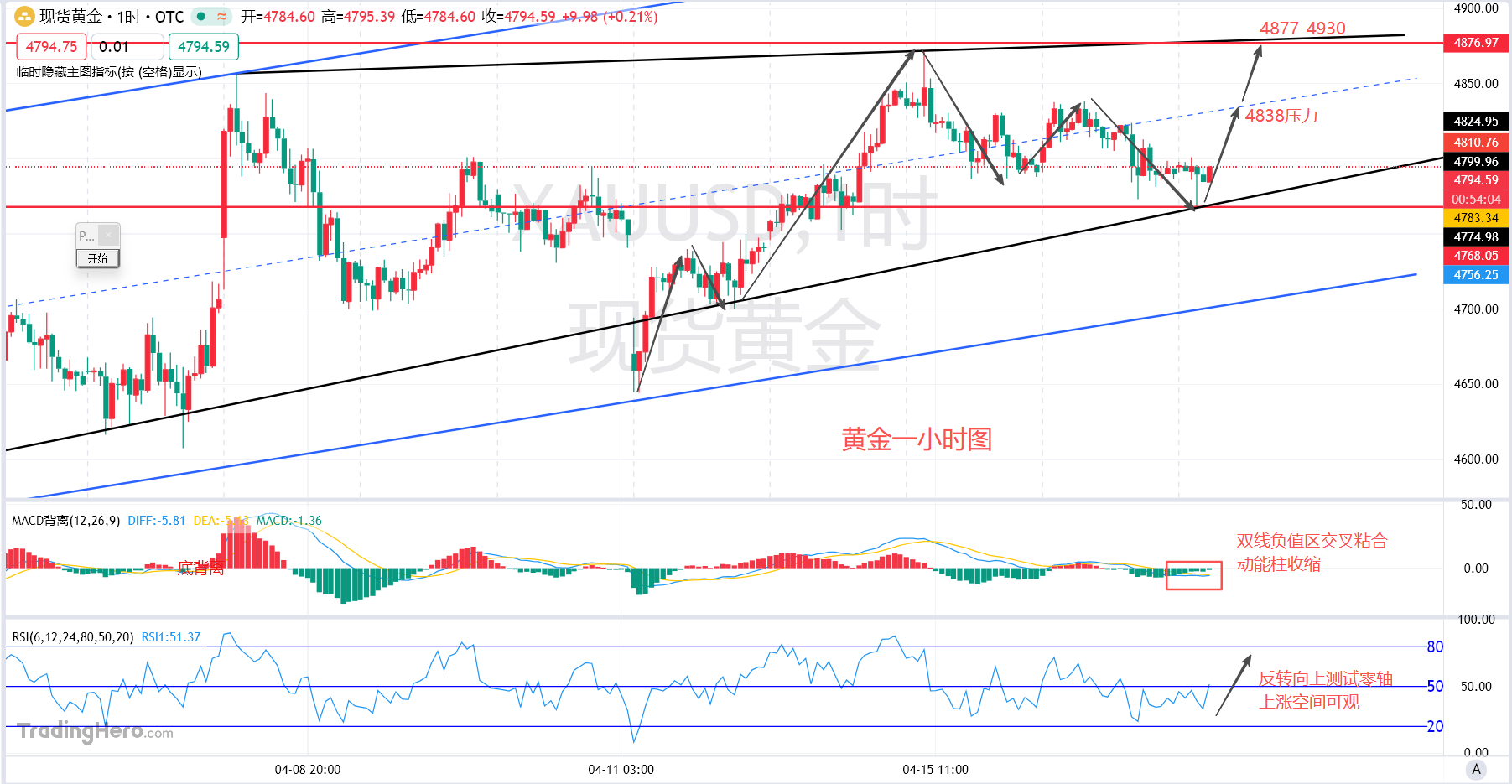 回到技术面黄金一小时级别盘内周期走势,能够看看到上方图中黑色箭头线表示展望行情继续走出上行的升浪,同时也是在上行通道之内的上涨楔形,楔形上方的黑色压力区间还是在4877美元附近。行情从4644美元开始走出升浪,同时也是四小时级别当中五浪的上行,当前一小时级别是在走三浪之后的四浪回调ABC浪,已经回踩至低点4768美元附近的支撑向上走出了上行,并未侵入一浪高点4744美元一下,所以符合波浪理论升浪的结构。