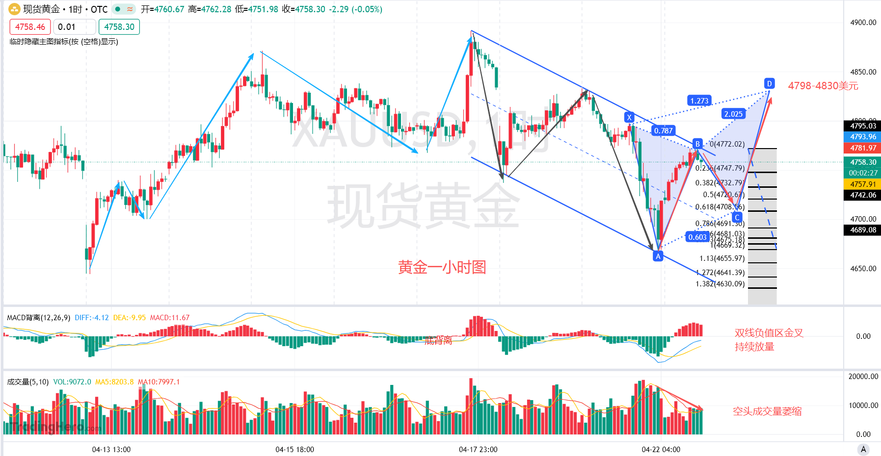 图中蓝色阴影区间表示展望行情走出谐波交易理论当中的蝴蝶形态,图中B点的位置位于斐波那契黄金分割线0.786美元的压制受阻,后市展望回踩下方支撑位后上行破位4780美元运行至拓展位试探4830美元附近的压制。技术指标MACD快慢双线在零轴线之下重新形成金叉,双线向上强势运行同时伴随动能柱向上放量,从下放来看盘内的成交量空头成家量也出现了萎缩,多头动能强势空头动能出现衰竭,后市行情低多看涨为主。