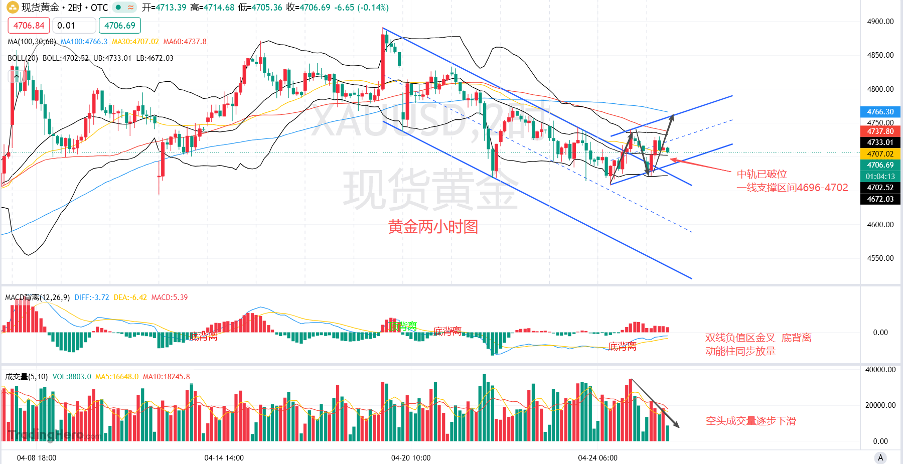从技术面来看行情在上一周基本上测试到两小时周期布林带就往下走,周五晚上突破之后就想要看变盘了,今天早上依旧跳空低开这是想干什么,在行情即将走升浪的时候不得制造出来涨不上去的假象?其次一小时周期在先前出现的下跌通道当前也已经向上破位了,今天早盘回踩4772的上轨就开始往上走,这不妥妥的想要走反向上涨的态势。对于今天行情的的操作,早上亚盘时段看到行情向下回撤,盘内一分钟级别出现了头肩底的看涨形态,但是这个死手,buy键死活不敢点,生怕行情再下去,周一的行情是飘忽不定的,没有出现明显的升浪之前没有选择盲目的进场交易,就这没有上车错过了4678美元的做多机会,无奈中午到了4729美元做了个空单,拿了几个点的利润就下车了,目前拟稿时段正在等待下方的4696-4700美元区间的支撑进场做多,如果升浪顺利开始运行的情况日内的上涨目标可以保守看向4750-4770美元区间等待再次突破。