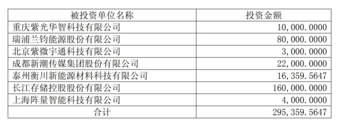 长江存储、紫微科技、紫光华智、衡川科技、瑞浦兰钧、新潮传媒。其中,除了新潮传媒以外,另外六家皆是硬科技企业,涉及人工智能、新能源、商业航天、集成电路等行业。据公告披露,目前泉泓共计投资了29.54亿元。