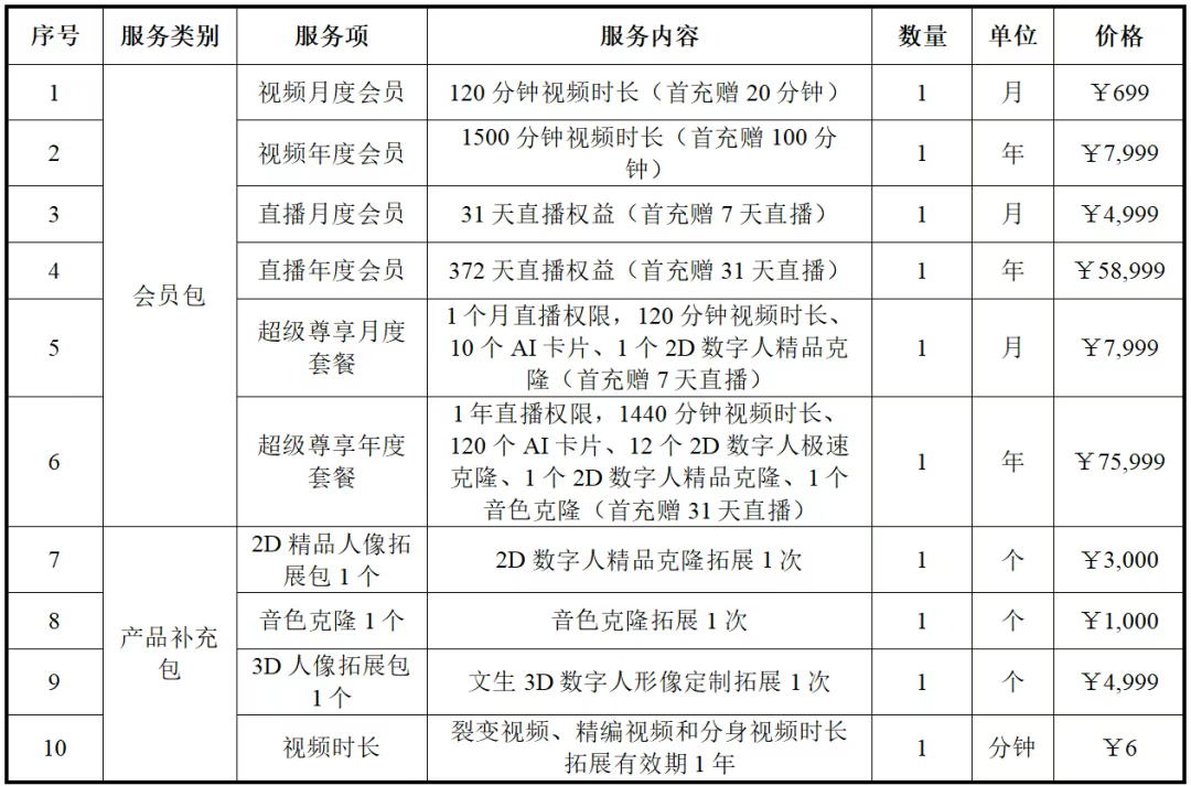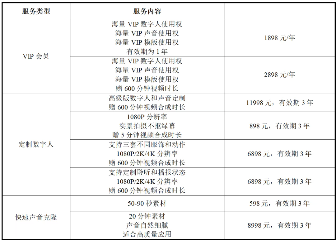 商汤如影的收费服务包括会员年包、定制数字人、声音克隆等,具体收费标准如下: