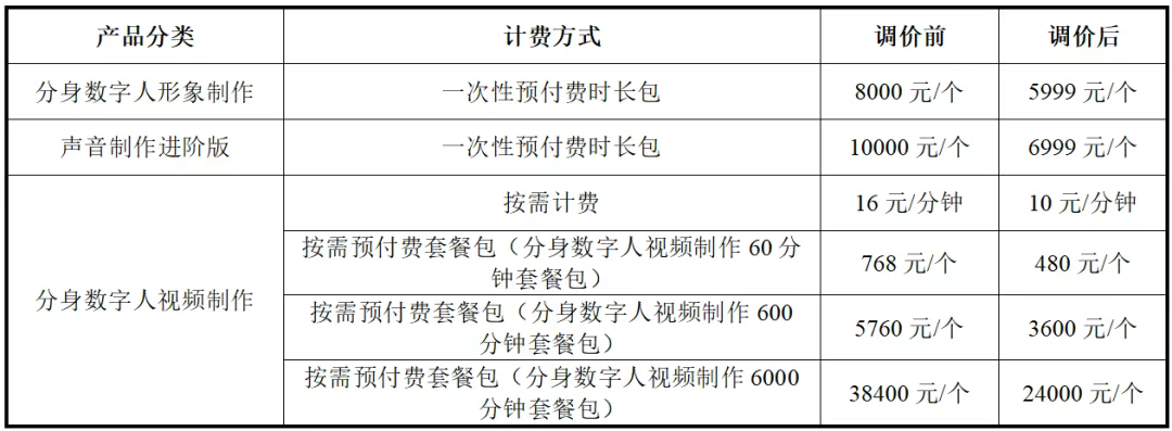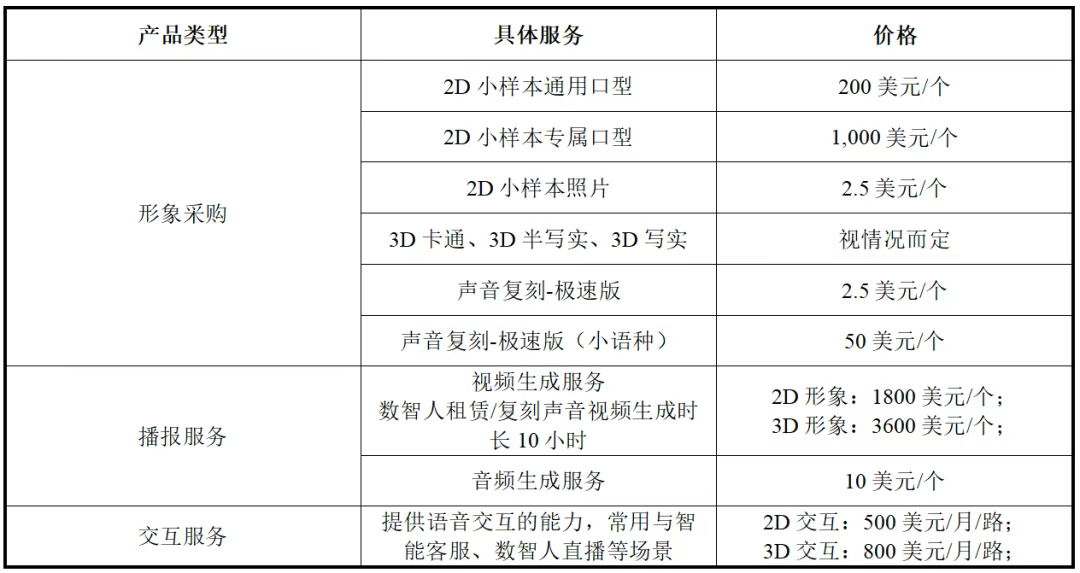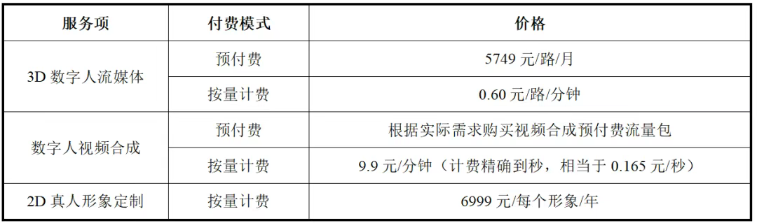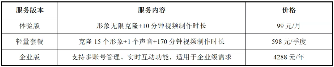 小冰公司推出"零样本克隆"技术,仅需40秒即可生成数字人分身,根据服务版本不同,收费也有所区分,具体收费标准如下:表7 小冰公司数字人收费标准
