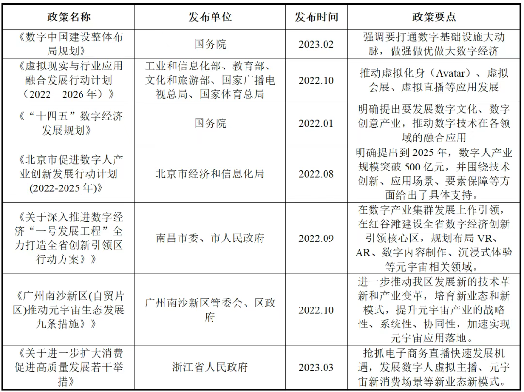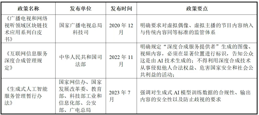 在出台以上政策鼓励行业发展的同时,我国也出台了相应行业监管规范性文件,明确将虚拟偶像、虚拟主播的节目内容纳入与传统内容同等标准的监管体系,提出使用AI数字人的机构主体需要对数字人产生的内容承担全部责任;严格要求AI技术生成内容必须在显著位置进行标识,防止技术滥用,侵犯他人合法权益。