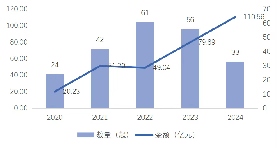 中国Al数字人行业正处于投融资活跃期,技术突破、成本下探与政策支持形成合力,推动行业从“工具”向“伙伴”演进。数据显示,2024年中国Al数字人相关投融资事件数量达33起,投融资金额达到110.56亿元创历年新高。2025年1-5月,中国Al数字人相关投融资事件数量和金额分别达到20起和24.45亿元。