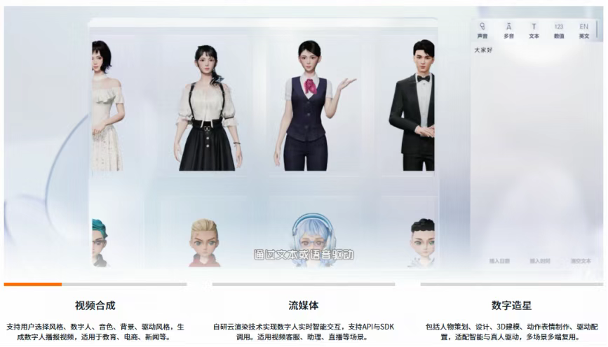 中游:主要涵盖AI数字人的核心技术研发和应用,包括软硬件系统开发、生产技术服务平台搭建、AI能力平台搭建等。这些企业负责将底层硬件与软件技术相结合,开发出具有特定功能的AI数字人产品。