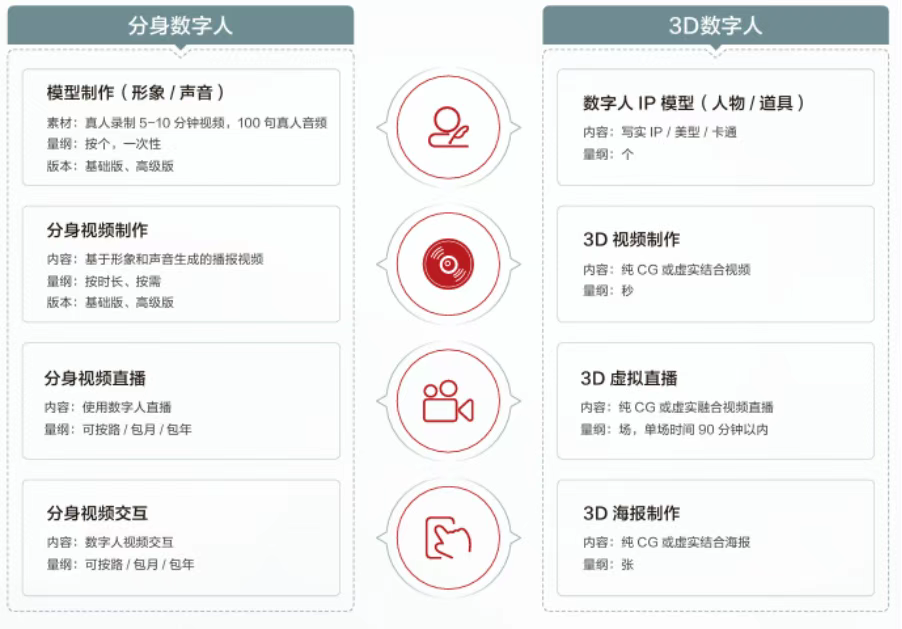 华为云数字内容生产线提供分身数字人和3D数字人两种数字人解决方案,其中分身数字人服务项包括模型制作、分身视频制作、分身视频直播、分身视频交互等;3D数字人服务项包括数字人IP制作、3D视频制作、3D虚拟直播、3D海报制作等。
