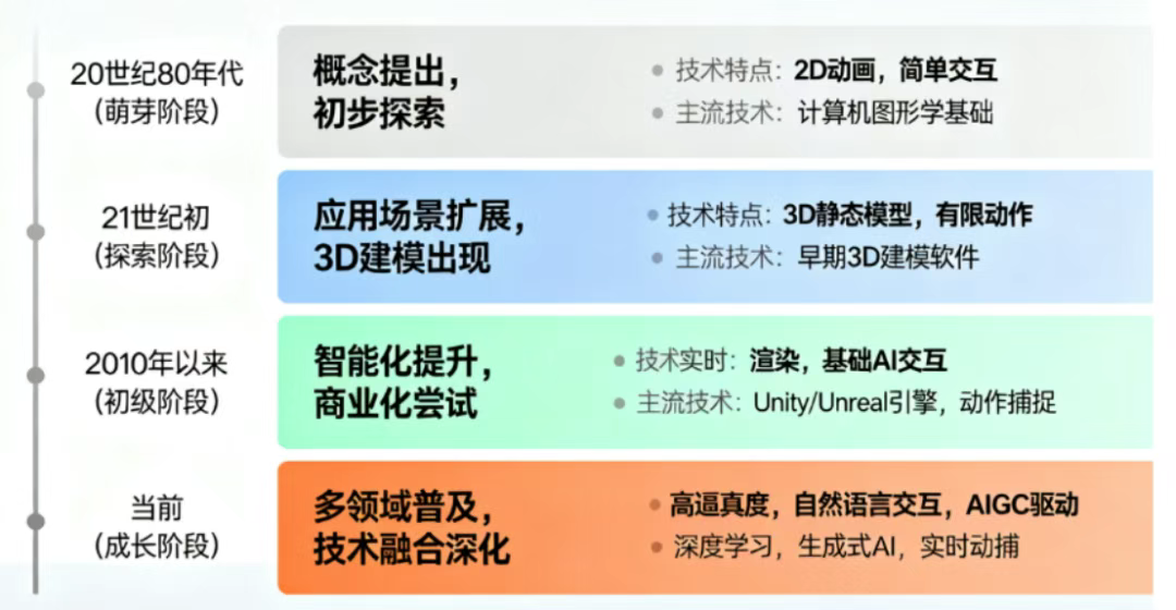 技术突破与快速发展阶段(2010年-2020年):深度学习、人工智能(AI)和大模型技术的兴起是这一阶段的关键。AI技术的突破使得数字人具备更强的自主学习、情感表达和自然交互能力。生成式人工智能(AIGC)的出现推动了数字人产业的创新,提升了生产效率并推动了规模化发展。
