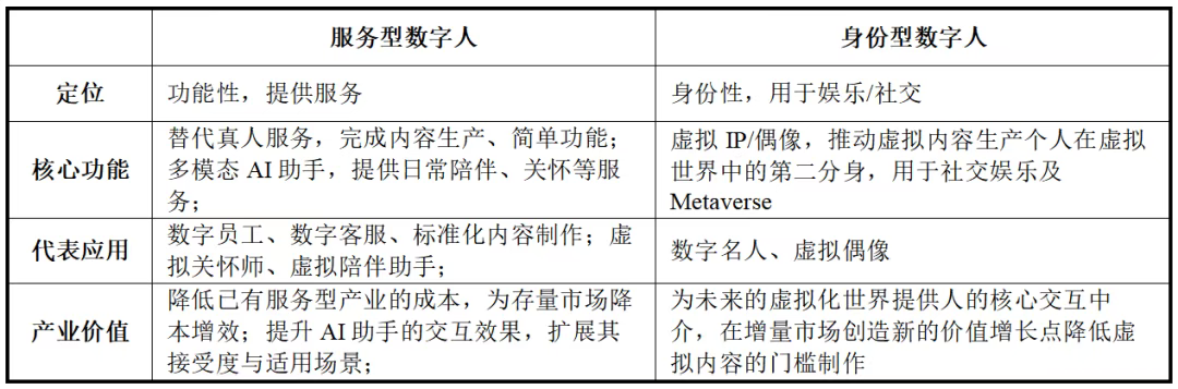 根据功能和应用场景分类,可以分为服务型数字人和身份型数字人。服务型数字人应用领域广泛,能够用在数字人主播、数字人老师教学、虚拟陪伴等。