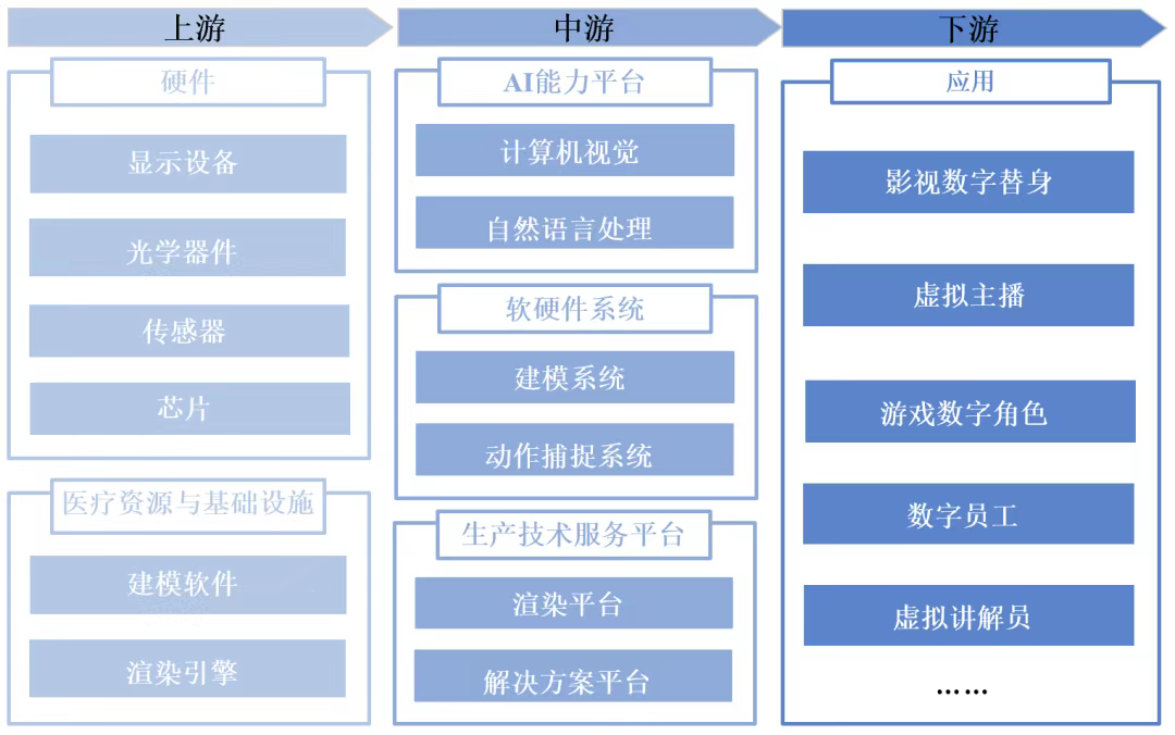 上游:主要包括芯片制造、传感器、硬件设备等基础元器件供应商及建模、渲染等软件服务供应商,这些企业为AI数字人的研发和生产提供核心硬件及软件支持。