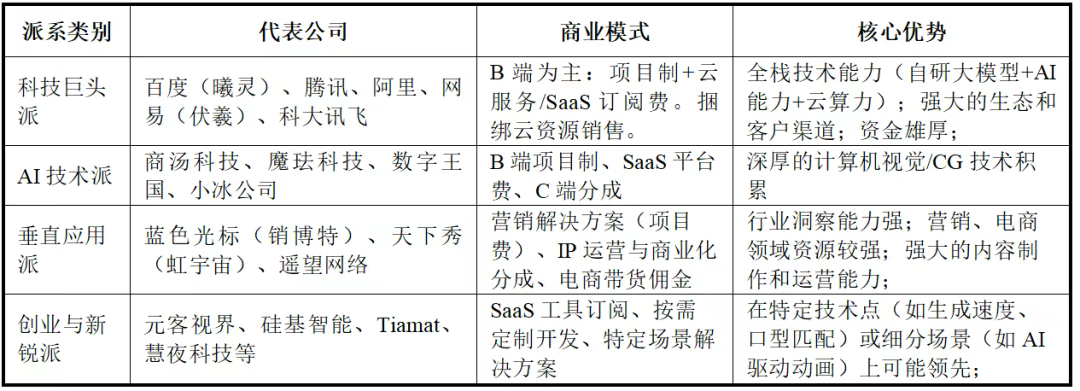 国内主要玩家大体上可分为科技巨头派、AI技术派、垂直应用派、创业与新锐派等四个不同的派系类别,其中科技巨头派包括百度、腾讯、阿里、网易、科大讯飞等,以B端客户为主,具备强大的生态和技术能力;AI技术派包括商汤科技、小冰公司等,该类型公司从成立之初定位就是人工智能服务商,具备一定的先发优势,其客户类型覆盖B端、C端用户,具备深厚的视觉和CG技术积累。此外,行业中还有一些针对垂直领域应用和特定场景应用的公司,例如蓝色光标、硅基智能、Tiamat等。
