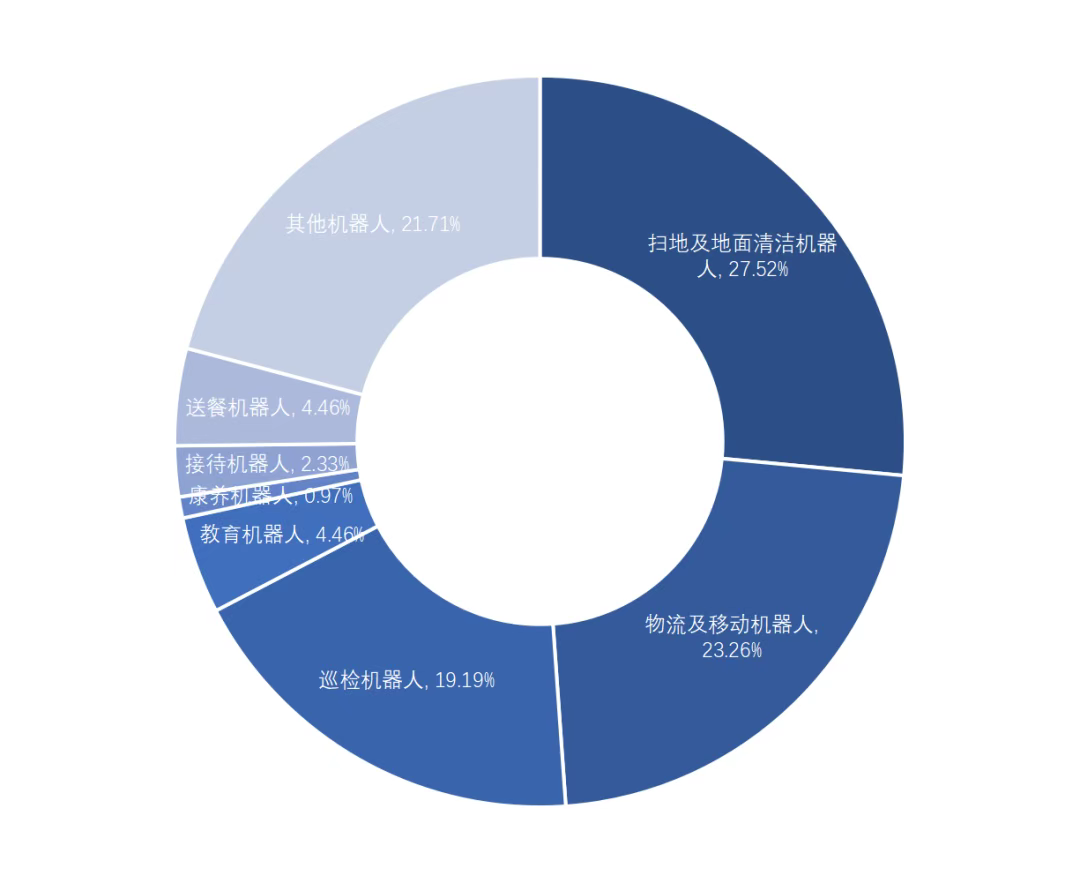 总体而言,从细分市场占比来看,目前我国服务机器人市场中,扫地及地面清洁机器人市场份额占比最大,达27.52%;物流及移动机器人位列第二,市场份额达23.26%;巡检机器人占比19.19%;其他服务机器人市场占比较小。