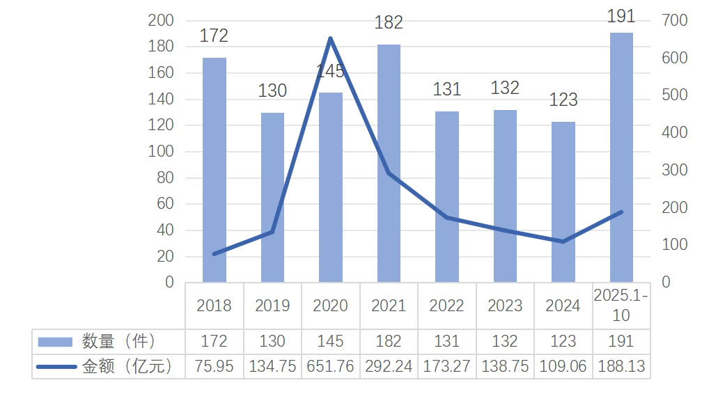 从2018年至2025年10月,中国服务机器人行业的融资金额与融资事件数量呈现出明显的阶段性变化特征。行业在2020年达到融资金额的历史峰值,当年融资数量145件,融资总额达651.76亿元,反映出单笔融资规模大。2021年融资数量攀升至182件的最高点,总金额回落至292.24亿元。2022年至2024年间,行业进入调整期,资本态度趋于谨慎。值得注意的是,2025年前十个月融资数量已反弹至191件,总金额回升至188.13亿元,显示资本市场关注度重新升温。