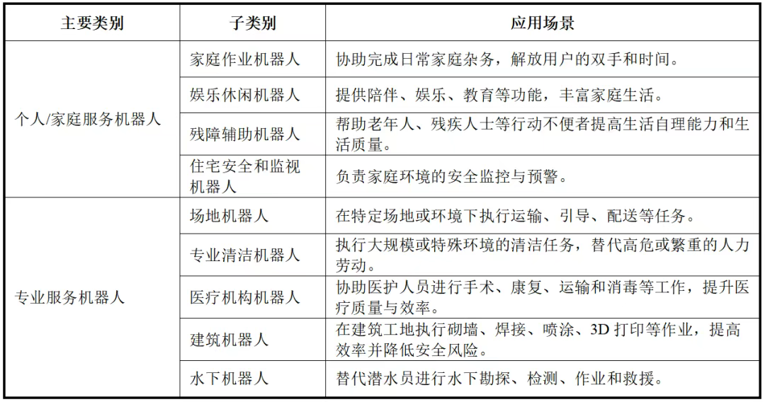 服务机器人已经深入日常生活的各个方面,主要应用于个人/家庭生活、商业服务以及专业领域,具体覆盖了家庭作业、情感陪护、养老助残、酒店接待、餐饮配送、医疗康复、物流运输和农业采摘等多个场景。