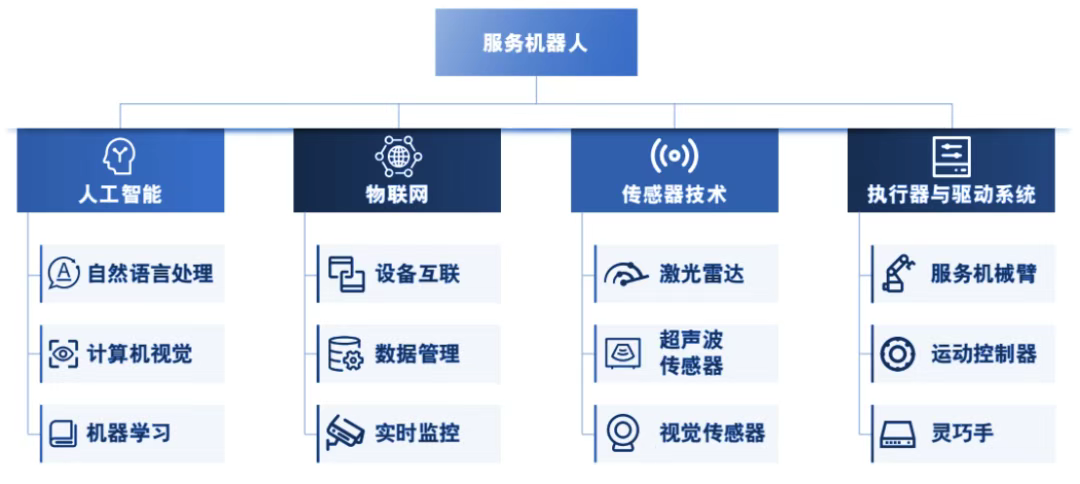 人工智能涵盖了自然语言处理、计算机视觉和机器学习等关键技术;物联网实现了设备互联、数据管理和实时监控;传感器技术则依赖于激光雷达、超声波和视觉传感器来感知环境;执行器与驱动系统具体表现为服务机械臂、灵巧手和运动控制器。这些技术共同构成了服务机器人智能感知、交互与执行的完整能力闭环。