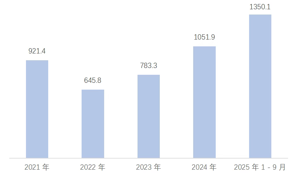 国家统计局数据显示,2021-2025年9月中国服务机器人产量波动增长。2021年因技术突破和市场需求爆发,产量大幅增长,达到783.3万台。2022年产量较2021年有所下降,但仍处于较高水平。之后服务机器人产量持续增长,到2025年服务机器人产量1-9月总产量为1,350.1万套,较去年同期增长16.3%。