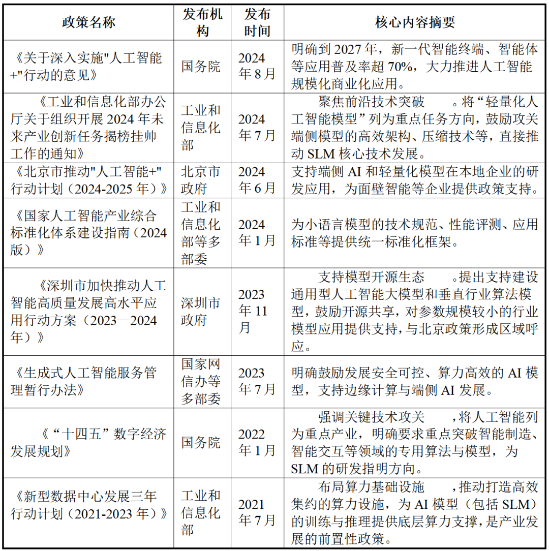 近年来,国家层面通过《关于深入实施“人工智能+”行动的意见》、《国家人工智能产业综合标准化体系建设指南(2024版)》等顶层设计,明确了智能终端的规模化普及目标,相关政策指出到2027年,新一代智能终端、智能体等应用普及率要超过70%,直接为小语言模型创造了广阔的市场需求。