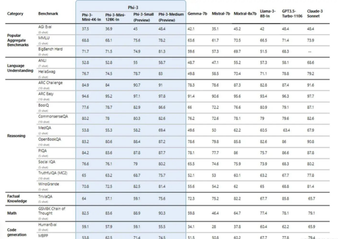 以Phi-3全系列、Gemma-7b、Mistral-7b等小语言模型的性能数据与Mixtral-8x7b、GPT-3.5-Turbo、Claude-3-Sonnet等大模型进行对比,语言理解、推理、数学、代码生成等方面,并没有出现明显的差异。具体如下图所示。