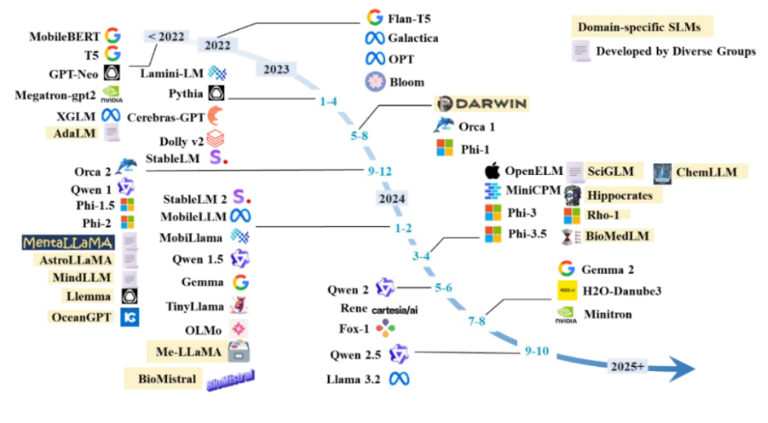 爆发增长(2023年及之后):这一年模型发布数量显著增加,并出现了关键趋势。微软发布的Phi系列(从Phi-1.5到Phi-2)展示了通过高质量数据训练小模型的巨大潜力。同时,领域专用模型开始涌现,如AstroLLaMA(天文学),标志着SLMs开始向垂直领域深入。开发团队也愈发多元,涵盖了学术界、工业界和开源社区。