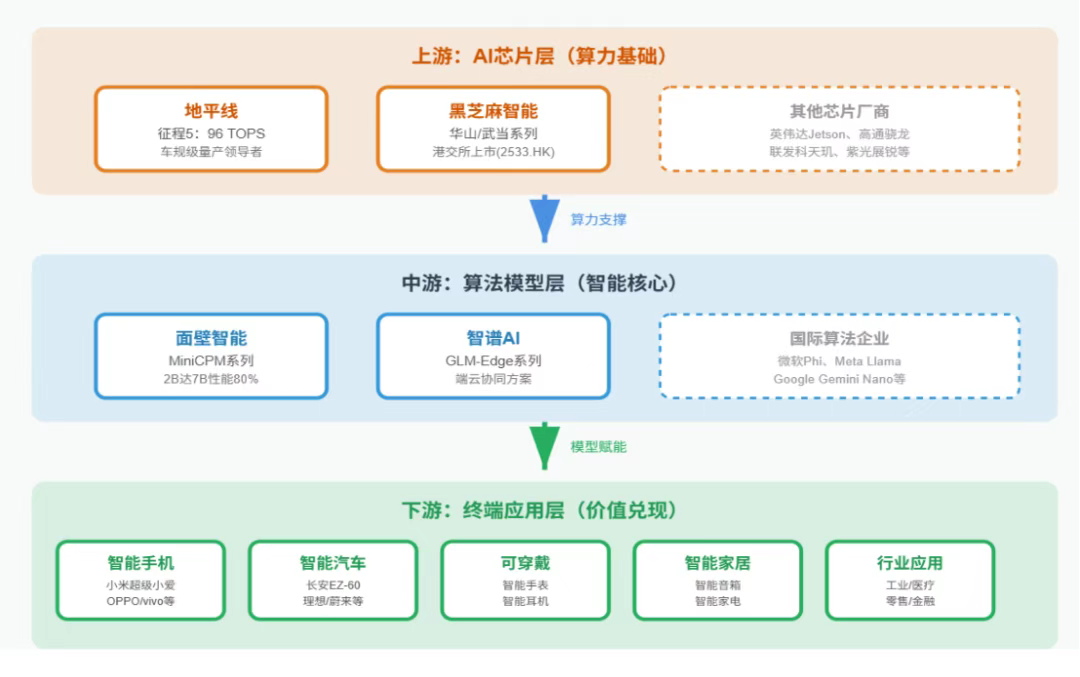 小语言模型产业链涵盖硬件基础设施、算法模型研发及行业终端应用的多层次生态体系。其最显著的特点是与"端、边、芯"(终端设备、边缘计算、芯片)的高度协同。与传统云端大模型依赖数据中心算力不同,SLM的价值实现必须深度嵌入终端设备的硬件能力和应用场景。