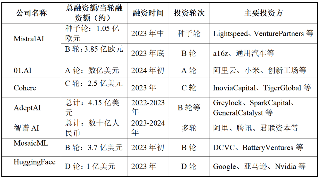 小语言模型的巨额融资成为常态,头部公司的单轮融资额动辄达到数亿美金或欧元量级。例如,MistralAI在短短半年内从种子轮(1.05亿欧元)迅速跃升至B轮(3.85亿欧元),中国的01.AI在A轮融资后估值即超过10亿美元,迅速跻身独角兽行列。