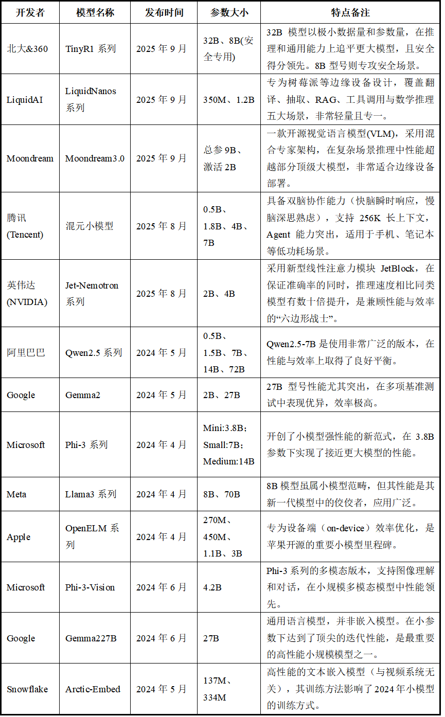 2024-2025年新发布的小语言模型汇总了来自全球顶尖科技公司(如Google、Microsoft、Meta、Apple、NVIDIA、阿里巴巴、腾讯等)和学术机构(如北大),其竞争焦点已从单纯追求“参数规模”转向追求“性能与效率的极致平衡”。开发者们正致力于打造在特定场景下(如边缘计算、手机端、安全领域)能力卓越,且能耗更低、速度更快的“小而强”模型。