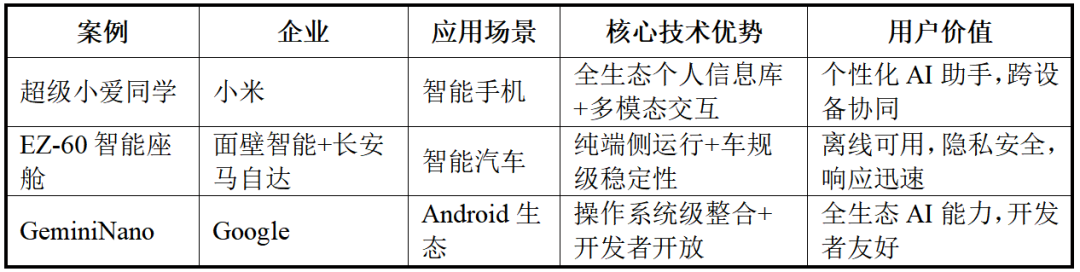 以Google、Apple为代表。这些企业通过操作系统和芯片的生态控制力,构建了难以撼动的竞争壁垒。Google的GeminiNano深度集成Android系统,覆盖全球数十亿设备;Apple的AppleIntelligence基于自研芯片,强调隐私优先和端云协同,截至2024年Q4,超过10亿台设备将获得该功能。