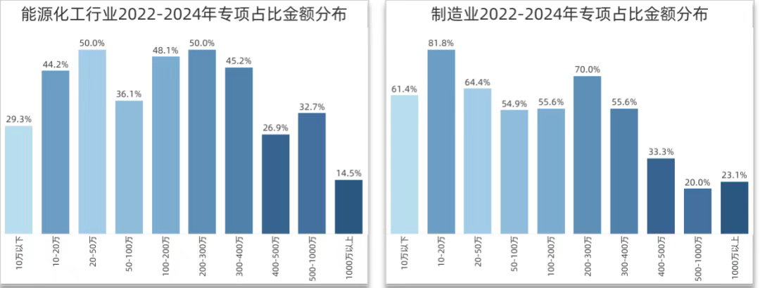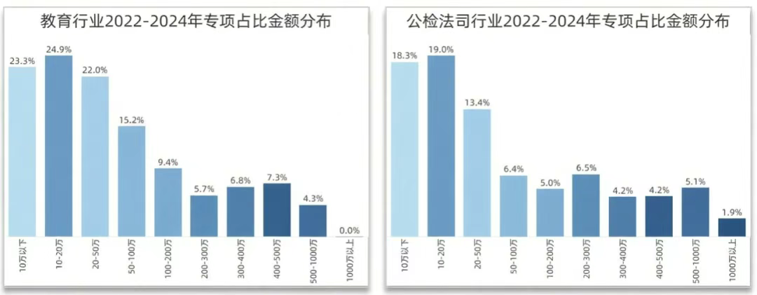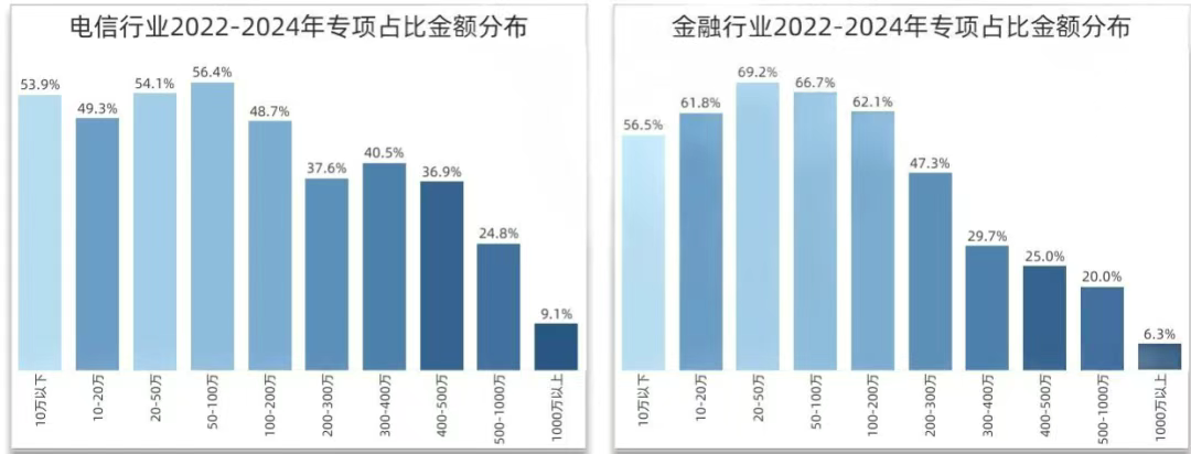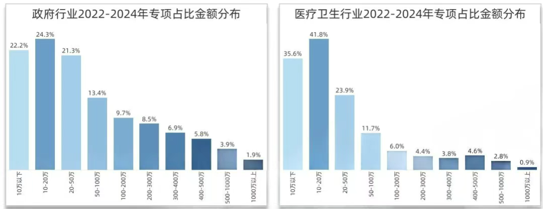 数据安全专项采购的金额分布上,各行业因业务属性与合规规范要求上的差异,也有所不同。