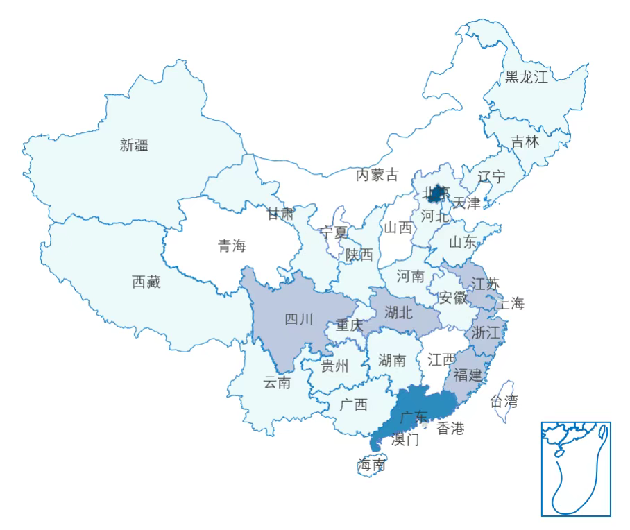 数据安全产业上市公司分布较为广泛,主要集中于北京和广东,二者占比总和超50%,其中北京55家,广东32家;除此之外,东部沿海及四川、湖北分布也较多。
