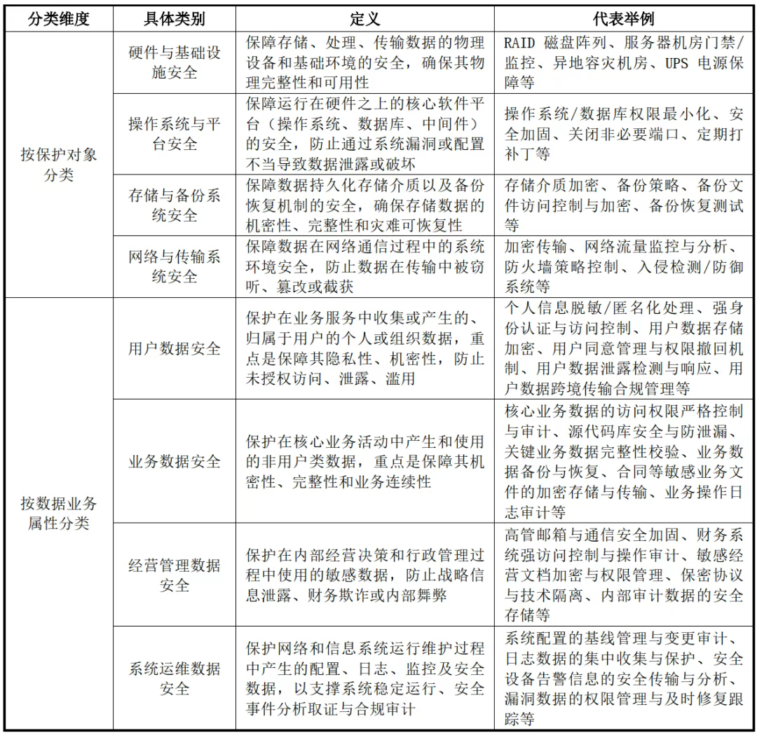 从保护对象划分,可分为硬件与基础设施安全、操作系统与平台安全、存储与备份系统安全、网络与传输系统安全;从数据业务属性划分,可分为用户数据安全、业务数据安全、经营管理数据安全、系统运维数据。