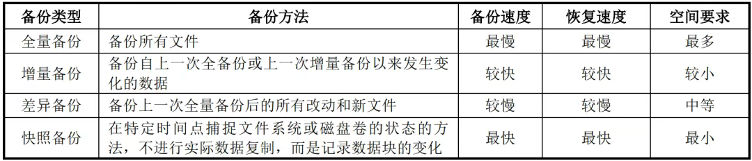 数据备份与恢复的方法有很多种,如全备份、增量备份、差异备份和快照等。全备份提供了完整的数据副本,但占用存储和备份时间最长;增量备份节省存储空间和时间,但恢复过程复杂;快照则以快速创建和高效的空间利用见长。