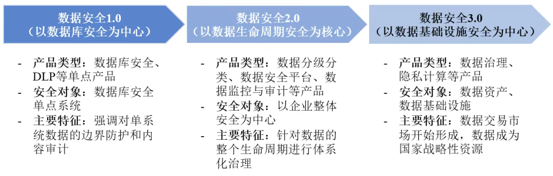 数据安全行业经历了以数据库安全为中心、以数据生命周期安全为核心、以数据基础设施安全为核心三个阶段,体现了从局部到全流程再到国家战略层面的演变逻辑。
