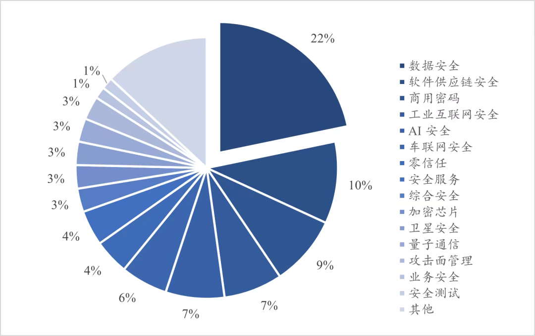 - “AI+安全”已成为市场主要投资方向。2024年数据安全领域投融资事件约15起,在网络安全行业的各细分领域中占比最高,达22%。