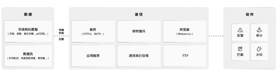 其识别内容发现风险的核心是,将不同的数据类型或内容制定不同的管控策略,对各种违规行为执行监控、阻断等措施,并对数据的全生命周期进行审计,防止企业核心数据以违反安全策略规定的方式流出而泄密。