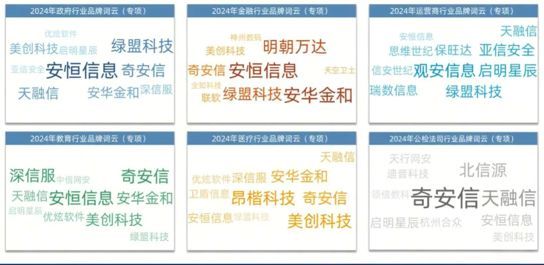 具体到数据安全产业在不同领域的品牌热度,政府行业安恒信息主导,绿盟科技、奇安信等跟进;金融行业安恒信息、安华金和突出;运营商行业观安信息、启明星辰、亚信安全领先;教育行业安恒信息、深信服、奇安信为主;医疗行业昂楷科技、美创科技等为核心;公检法司奇安信、天融信等主导。