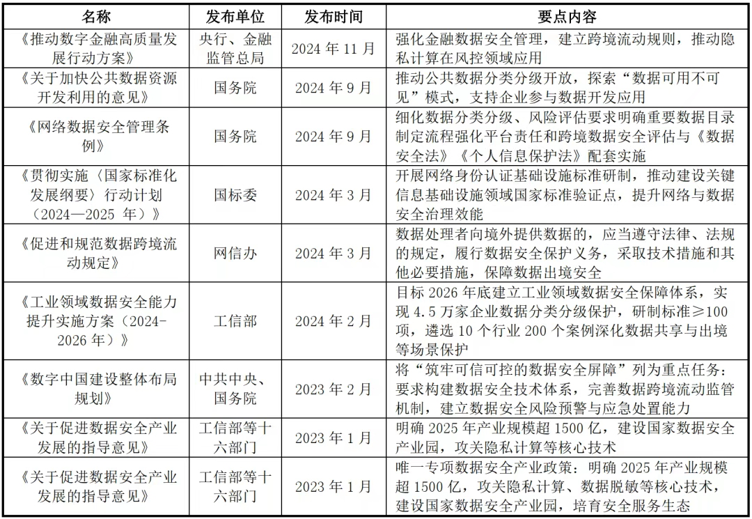 近几年,中共中央、国务院及央行、金融监管总局、工信部等多部门密集出台系列政策推动数据安全及相关行业发展。