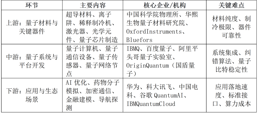 上游:聚焦于量子材料与关键器件,如超导材料、稀释制冷机等,由中国科学院物理所、Oxford Instruments等机构主导,其发展受制于材料纯度、制冷极限与器件可靠性等基础问题。