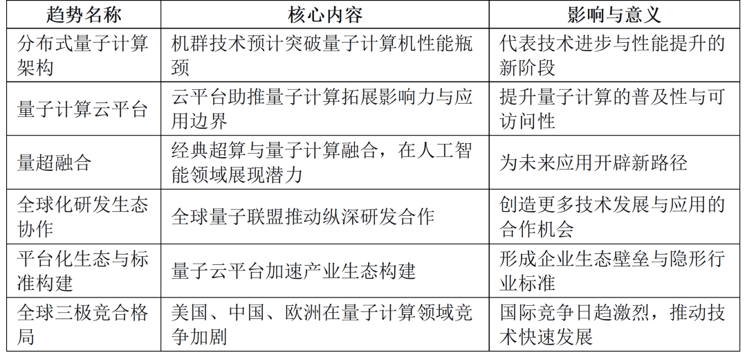 机群技术被预测将突破量子计算机性能的瓶颈,代表着技术进步和性能提升的新阶段;云平台的发展正助力量子计算持续拓展其影响力和应用边界,使量子计算技术更加普及和可访问;经典超级计算机与量子计算的融合创新在人工智能领域展现出巨大潜力,为未来的应用开辟新路径;此外,全球范围内的量子联盟促成了纵深研合作的新局面,为量子计算技术的发展和应用创造了更多合作机会;量子云平台将加速产业生态的构建,形成企业的生态壁垒和隐形的行业标准,美国、中国、欧洲在全球量子计算领域各显其能,国际竞争不断激烈。