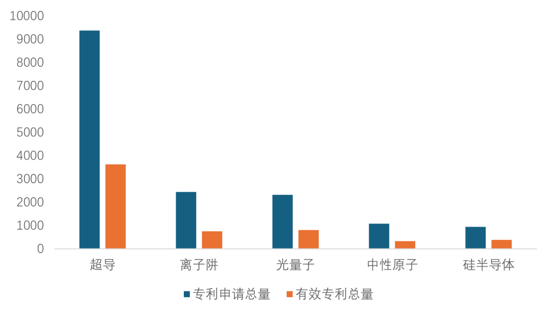 超导量子计算路线长期被业界寄予厚望。量子计算不同技术路线的全球专利数量中,超导量子计算路线专利的全球申请量为9380件,全球授权量为3976件。从专利申请总量和授权总量两方面均可看出,超导路线在五条技术路线中表现最为突出。