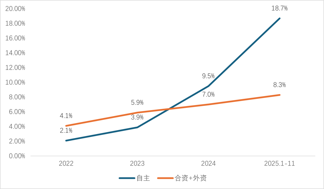 2025年1-11月,搭载城市NOA功能的乘用车销量中,自主品牌销量达到253.73万辆,占比达到81.1%,展现出自主品牌乘用车在智能网联领域的创新活力和竞争力。其中,自主品牌销量中搭载城市NOA功能的车型销量占比达到18.7%,较2024年占比翻一番,且远高于平均15.1%的占比水平;而合资品牌搭载NOA功能的乘用车销量占比仅为8.3%,较2024年占比提高1.3个百分点,市场规模有所提升。