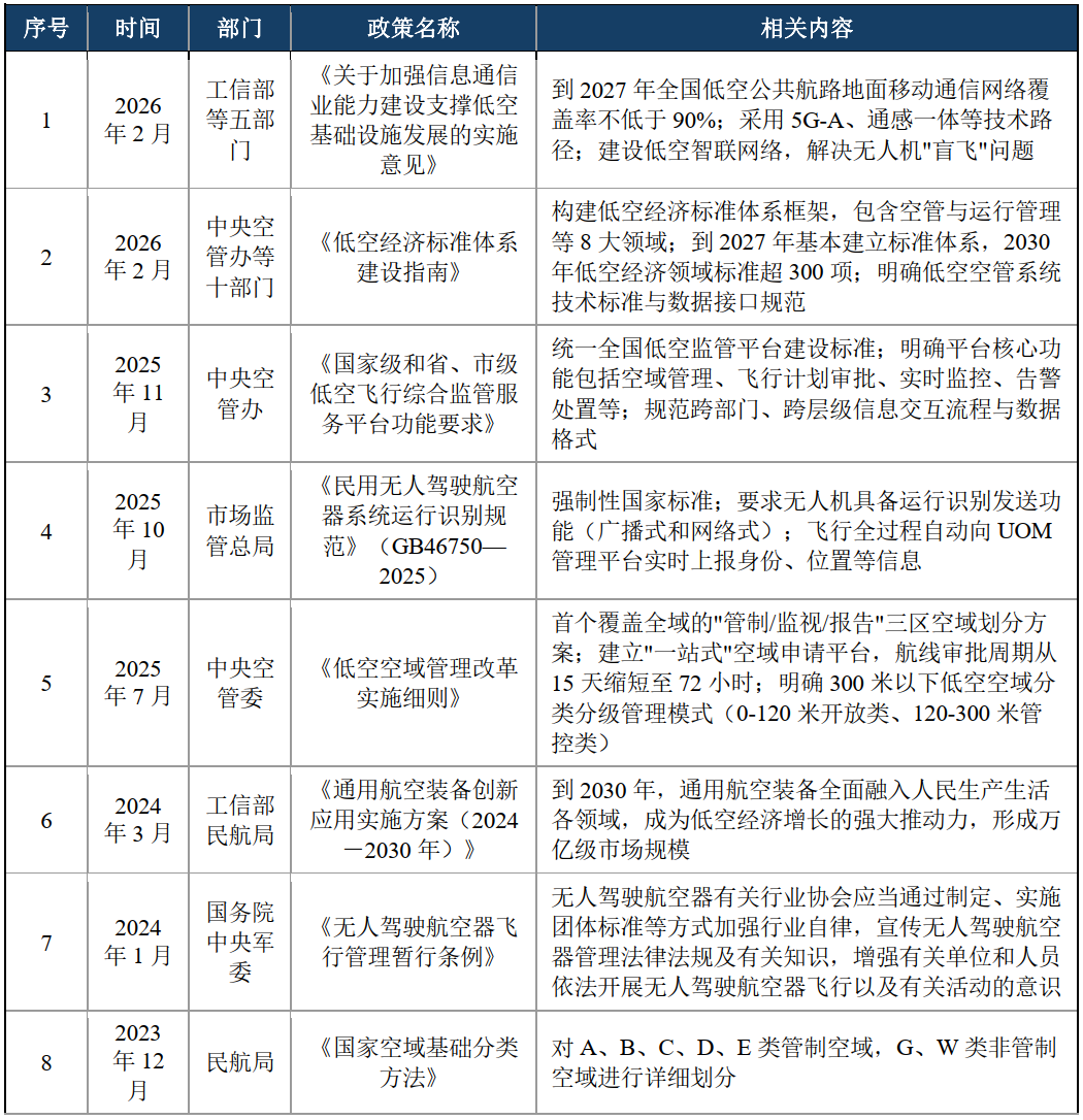 2023至今,我国低空经济领域密集出台相关政策,多部门协同构建全链条规制体系。首先,夯实无人机飞行管理、空域分类划分等基础法规;其次,推进低空空域分级管控、一站式审批提速等核心改革,同步搭建全国统一监管平台、落地无人机运行识别强制性国标;第三,完善低空通信网络建设与全领域标准体系,明确2027年低空航路网络覆盖率、标准体系搭建及2030年万亿级产业规模,破解无人机“盲飞”、监管碎片化等痛点,为低空经济规模化、规范化发展筑牢制度根基。