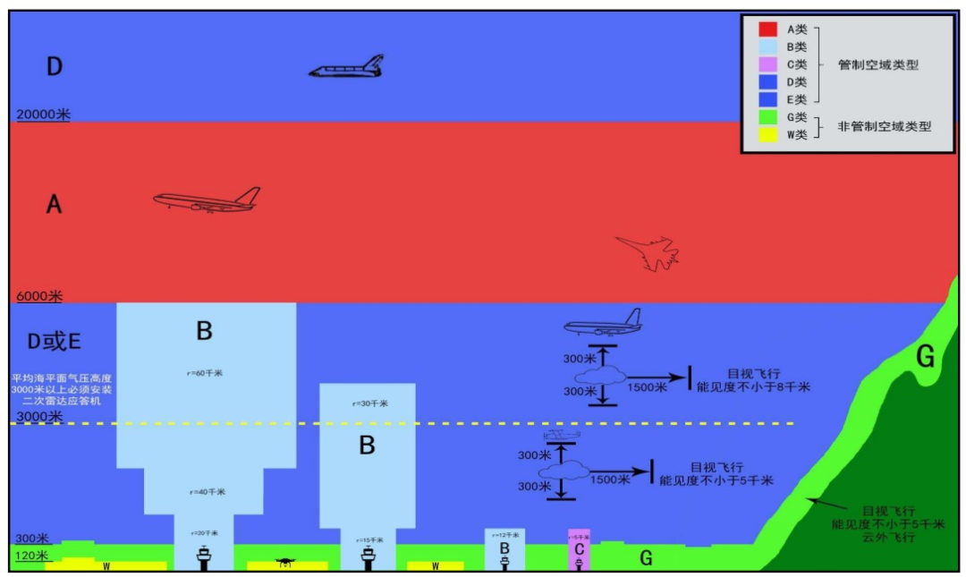 依据航空器飞行规则和性能要求、空域环境、空管服务内容等要素,空域划分为A、B、C、D、E类(管制空域),G、W类(非管制空域)。