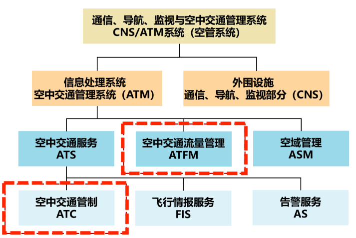 空管系统是通信、导航、监视与空中交通管理系统为一体的综合性的体系,包括通信、导航、监视(CNS)和空中交通管理(ATM)四个主要部分。空中交通管理系统是空管工作人员用来实际操作和管理飞行交通的信息处理平台,这一完整体系由空中交通服务(ATS)、空中交通流量管理(ATFM)和空域管理(ASM)三个核心部分构成。