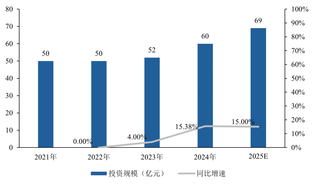 空管系统作为低空经济核心基础设施,其投资规模也与产业发展节奏耦合。2021-2022年投资约50亿元,以稳健投入完成低空适配改造与基础能力搭建;2023年小幅增长至52亿元,适配多元化运营场景;2024年跃升至60亿元,在政策与产业双驱动下进入智能化、网络化升级的快速增长期;2025年投资或达69亿元,投资增长既反映产业对核心基建的迫切需求,也彰显市场对低空经济长期潜力的信心。