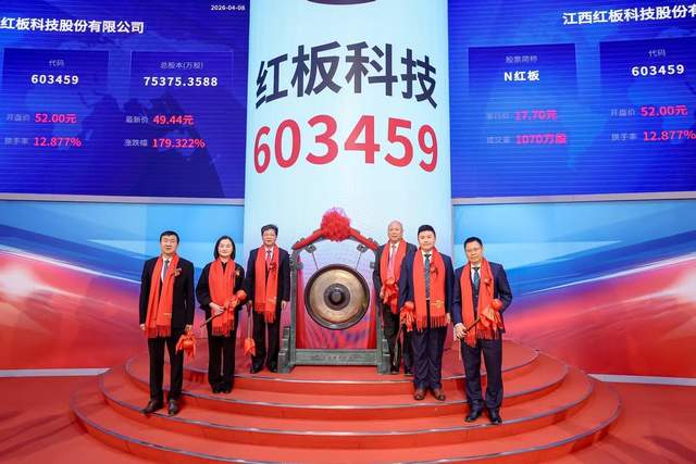 2026年4月8日,江西红板科技股份有限公司(股票简称:红板科技;股票代码:603459)在上海证券交易所主板成功上市。本次公司发行价格为17.70元/股,上市首日开盘价为52.00元,较发行价上涨193.79%。以开盘价计算,公司市值达370.85亿元。
