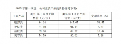 除了营销投入,产品提价也是丸美生物营收增长的重要因素。2024 年,丸美生物多个品类产品价格呈现大幅上调趋势。眼部类产品的平均售价变动率在四个季度分别为 15.11%、16.41%、9.49% 和 82.60%;护肤类产品的平均售价变动率分别为 37.89%、42.21%、43.07% 和 34.88%;洁肤类产品的平均售价变动率分别为 28.53%、8.06%、11.22% 和 15.72%。到了 2025 年第一季度,提价趋势仍在延续,眼部护理品类均价同比飙升 54.57%,护肤类、洁肤类、美容类产品价格分别上调 8.37%、16.47%、7.28%。