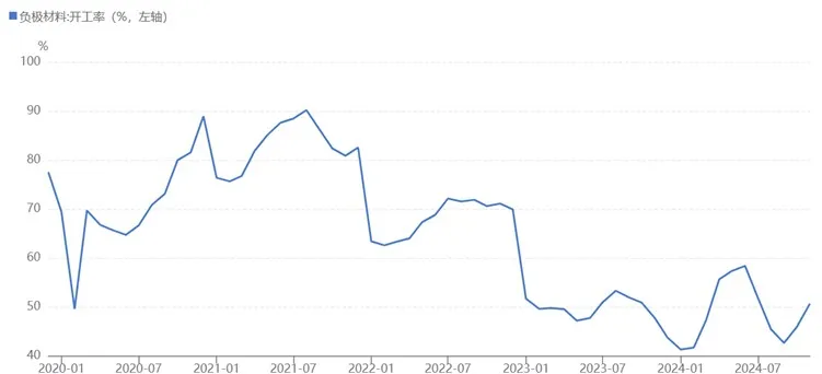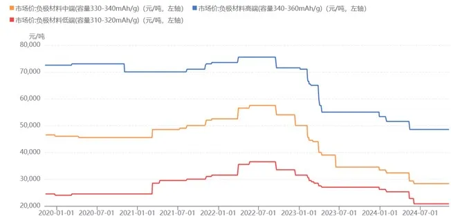 从供需关系来看,过去几年负极材料也经历了较为严重的产能过剩。目前,全国产能约为300万吨,相对200万吨左右的需求,过剩50%左右,产能利用率较低。同时,产品价格近两年持续下跌,2024年仍处于下跌态势。