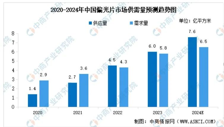 偏光片是将聚乙烯醇(PVA)膜和三醋酸纤维素(TAC)膜经拉伸、复合、涂布等工艺制成的一种高分子材料,是显示面板的关键原材料之一。随着面板行业向国内转移,中国市场的偏光片需求量(面积)保持了较快增长。