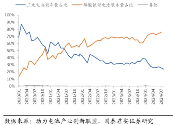 但由于磷酸铁锂技术的进步和更高的安全性,其在正极材料中的渗透率持续上升,导致三元材料量价齐跌。截至2024年底,磷酸铁锂在单月装车中的占比已经达到接近80%;三元材料的装车量占比只有20%左右。